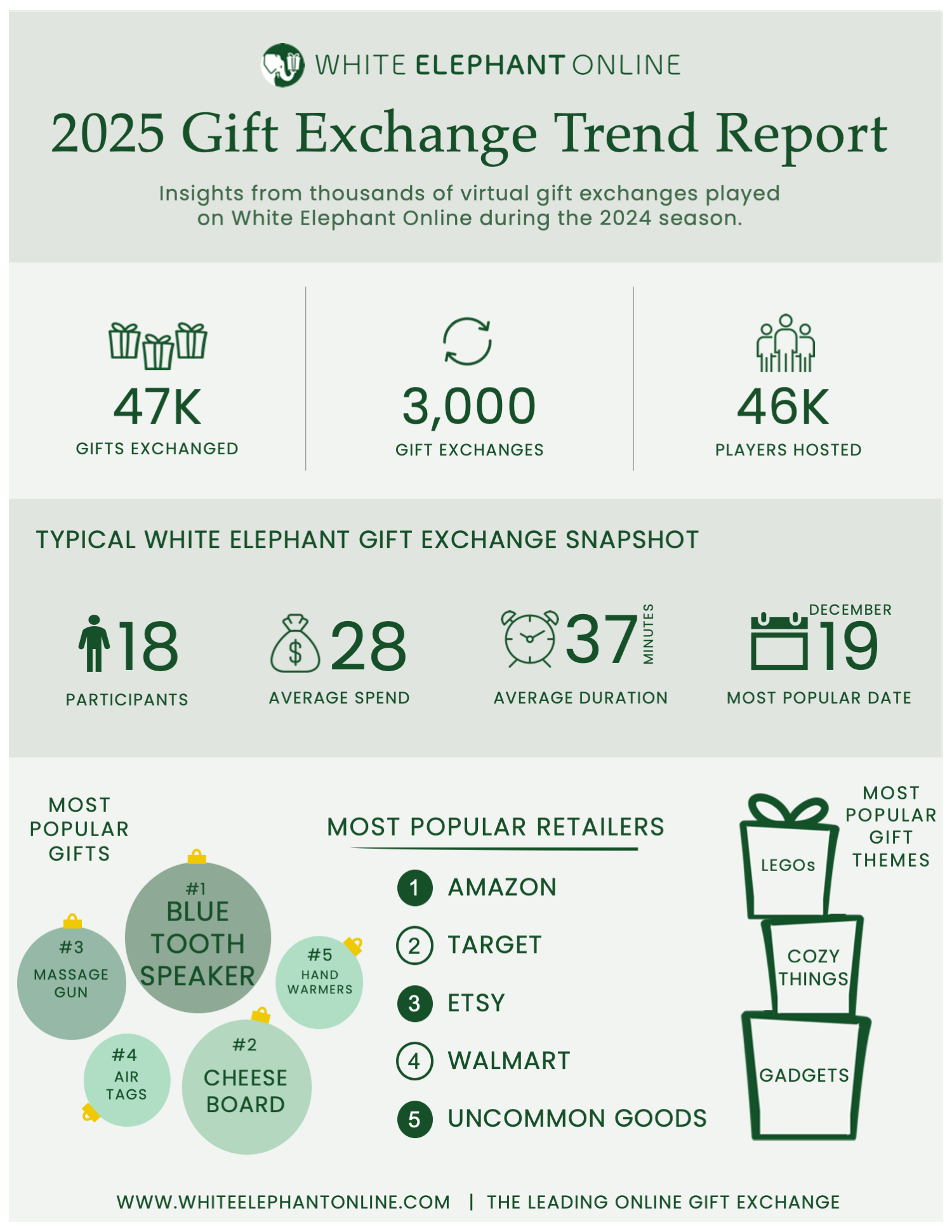 Thousands of companies and families used White Elephant Online to celebrate the holidays remotely last year. In our 5th annual report we crunched the numbers to bring you more fun and interesting insights from our 2024 holiday season!
