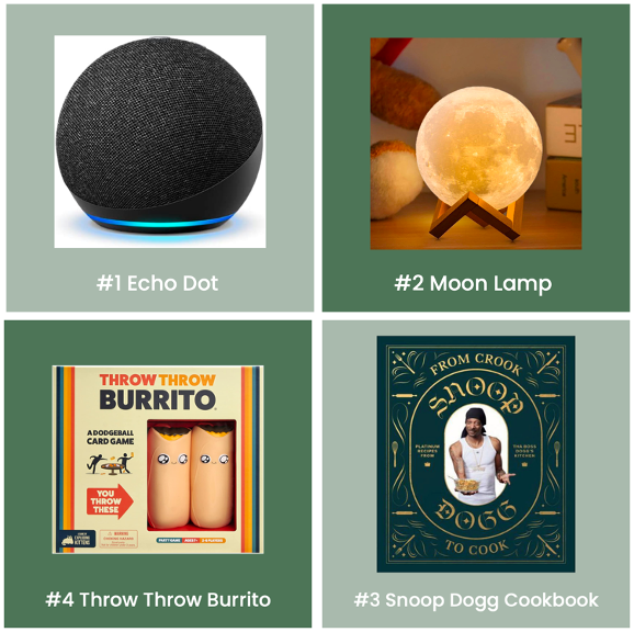 The top gifts of 2021 reflected a year when people were still spending more time at home and looking for ways to make their spaces feel brighter, smarter, and more fun. The Echo Dot and Moon Lamp catered to the home-refresh trend, offering both convenience and cozy ambiance. Meanwhile, playful picks like Throw Throw Burrito and the Snoop Dogg Cookbook brought lighthearted entertainment and creativity into the mix. Together, these gifts showed how 2021 was all about enhancing the home and finding joy in the little things - perfect for a season of staying connected, even from afar.