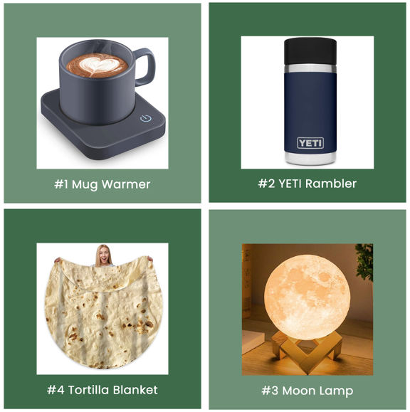 The top gifts of 2022 reflect a year when people were craving warmth, comfort, and a little magic in their everyday routines. Practical favorites like the Mug Warmer and YETI Rambler spoke to the rise of cozy desk setups and the return of office coffee moments, whether at home or hybrid. Meanwhile, the Moon Lamp and the delightfully silly Tortilla Blanket added a playful, whimsical touch to the mix, proving that lighthearted gifts still dominated the steal-worthy categories. In 2022, teams leaned into small luxuries and mood-boosters that made long workdays (and long winters) just a bit brighter.